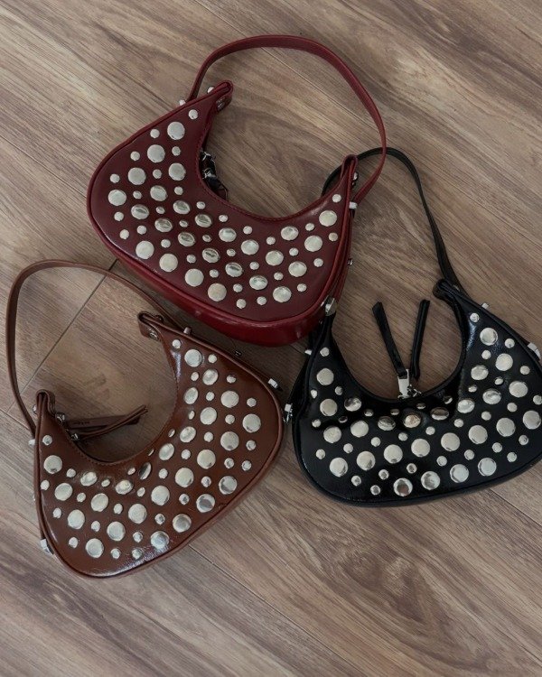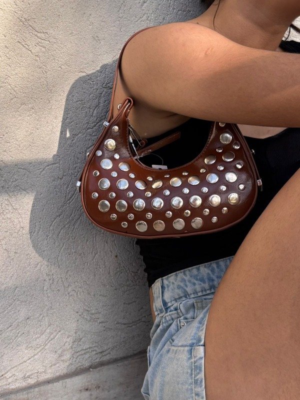 Una pieza con mucho carácter y estilo. Esta mini cartera baguette en eco-cuero marrón destaca por sus apliques metálicos circulares, creando un look moderno con aires retro.